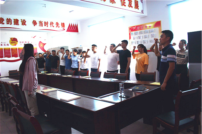 首先,舉行的是入黨宣誓儀式。14名黨員面對(duì)鮮紅的黨旗,在領(lǐng)誓人李曉暢的帶領(lǐng)下莊嚴(yán)宣誓,立誓遵守黨的章程,嚴(yán)守黨的紀(jì)律,對(duì)黨忠誠(chéng),為共產(chǎn)主義奮斗終身。