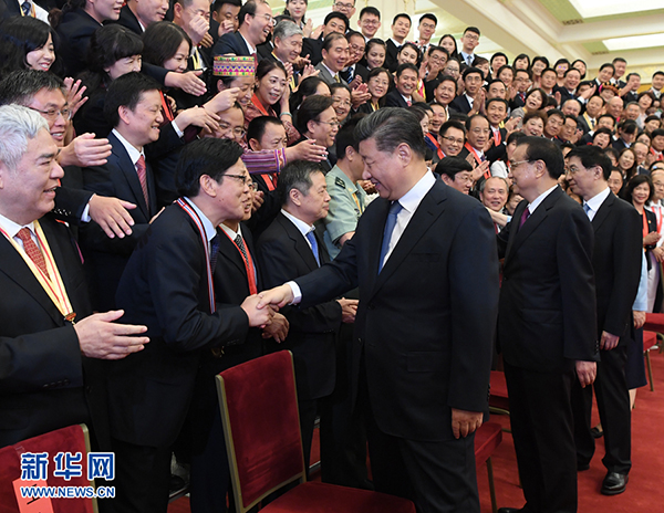 9月10日,黨和國(guó)家領(lǐng)導(dǎo)人習(xí)近平、李克強(qiáng)、王滬寧等在北京人民大會(huì)堂會(huì)見(jiàn)慶祝2019年教師節(jié)暨全國(guó)教育系統(tǒng)先進(jìn)集體和先進(jìn)個(gè)人表彰大會(huì)受表彰代表。新華社記者 申宏 攝