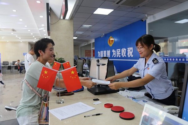 在阜陽市青年文明號—臨泉縣稅務(wù)局第一分局的大廳前臺桌面上,一幅幅五星紅旗映襯著黨員稅務(wù)干部年輕的面龐,增添了國慶70周年的節(jié)日氣氛。