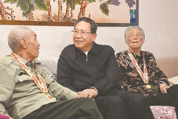 在新中國成立70周年之際,9月24日上午,省委書記李錦斌深入大別山革命老區(qū)金寨縣走訪慰問老戰(zhàn)士老同志代表,為他們佩戴上由中共中央、國務院、中央軍委頒發(fā)的“慶祝中華人民共和國成立70周年”紀念章,向他們致以崇高敬意和親切問候。