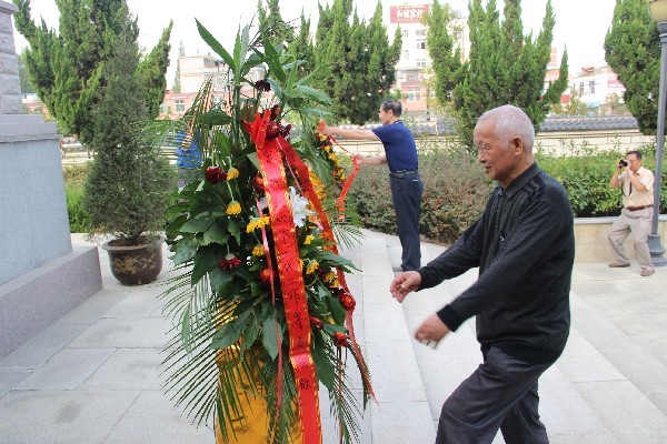 上午9時(shí),在莊嚴(yán)肅穆的氣氛中活動(dòng)開始,4名少先隊(duì)員抬起花籃緩步前進(jìn),將花籃排列放在紀(jì)念碑基座前,洪秀嶺、趙本金作為代表為烈士整理花籃緞帶,緬懷先烈。