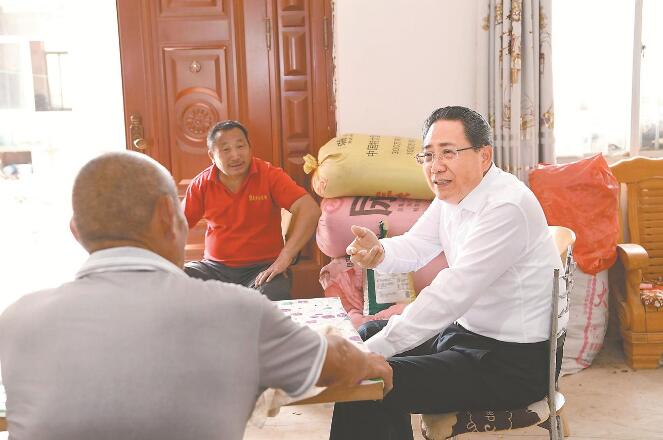 9月23日至26日,省委書記李錦斌深入六安、阜陽(yáng)、亳州市,實(shí)地督導(dǎo)調(diào)研“不忘初心、牢記使命”主題教育、“三個(gè)以案”警示教育、脫貧攻堅(jiān)、生態(tài)環(huán)保等工作。這是9月25日,省委書記李錦斌在阜陽(yáng)市潁東區(qū)口孜鎮(zhèn)大壩村貧困戶盧鳳彬(左一)家中與村民交談。本報(bào)記者 吳文兵 攝