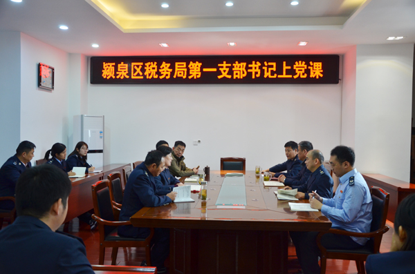 10月22日,潁泉區(qū)稅務局第一支部書記范亞紅在三樓會議室為一支部全體黨員干部上“不忘初心、牢記使命”主題教育專題黨課。第一支部全體黨員干部參加會議。