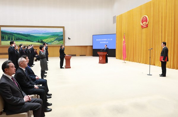 宣誓后,李克強說,忠于憲法、遵守法律是每一名公職人員必須遵循的基本行為準(zhǔn)則,讓人民過上好日子是每一名公職人員必須謹(jǐn)記的奮斗目標(biāo)。他要求大家堅持以習(xí)近平習(xí)近平新時代中國特色社會主義思想為指導(dǎo),依法履職,為民履職,實干履職,廉潔履職。帶頭尊法學(xué)法守法用法,積極推進(jìn)改革創(chuàng)新,在攻堅克難中彰顯擔(dān)當(dāng),在狠抓落實中展現(xiàn)作為,嚴(yán)守紀(jì)律規(guī)矩,嚴(yán)格秉公用權(quán),勤儉辦事,厲行節(jié)約,傾情竭力把人民群眾最關(guān)切最期盼的事情辦實辦好,齊心協(xié)力推動經(jīng)濟社會持續(xù)健康發(fā)展。
