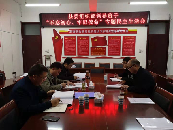 按照縣委“不忘初心、牢記使命”主題教育工作安排,12月9日下午,太和縣委組織部召開“不忘初心、牢記使命”專題民主生活會??h委第四巡回指導組張輝、張向陽到會指導,縣委組織部副部長杜奎主持會議,縣委組織部班子成員參加會議。