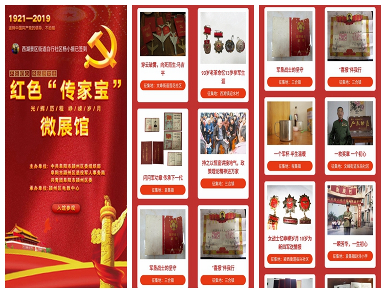 一是網(wǎng)上微展館“引航”。為了迎接中國(guó)共產(chǎn)黨建黨九十八周年,落實(shí)習(xí)近平總書(shū)記“紅色基因就是要傳承”的囑托,潁州區(qū)委組織部、區(qū)退役軍人事務(wù)局、團(tuán)區(qū)委向全區(qū)各級(jí)基層黨組織、黨團(tuán)員和退役軍人以及各條戰(zhàn)線(xiàn)的工作者開(kāi)展征集活動(dòng),尋找革命前輩、老黨員留下的彌足珍貴的革命史料和紅色印記。引導(dǎo)黨員干部傳承紅色基因,弘揚(yáng)繼承艱苦奮斗的革命精神,策劃推出了兩次紅色“傳家寶”征集活動(dòng),全區(qū)共征集到紅色“傳家寶”281件,我與紅色“傳家寶”的故事49個(gè),同時(shí)利用“潁州先鋒”公眾號(hào)開(kāi)辦微展館。以“互聯(lián)網(wǎng)+”的氣質(zhì)、場(chǎng)景式的呈現(xiàn),從“紅色故事”入手破題黨員教育,用聲音和畫(huà)面帶領(lǐng)廣大黨員干群走進(jìn)“微展館”,聆聽(tīng)每一件紅色傳家寶背后的故事?!凹t色傳家寶”活動(dòng)先后被中組部“共產(chǎn)黨員”網(wǎng)、“人民網(wǎng)”、“學(xué)習(xí)強(qiáng)國(guó)”等平臺(tái)推送報(bào)道,并入選主題教育全國(guó)課件集錦。“潁州先鋒”微信公眾號(hào)也因此榮獲全國(guó)黨建網(wǎng)站優(yōu)秀作品展示交流活動(dòng)“優(yōu)秀組織獎(jiǎng)”。