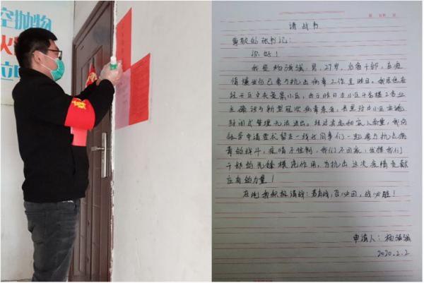 “我鄭重申請(qǐng),留在一線與同事們一起參與抗擊病毒的戰(zhàn)斗中,疫情不控制,我們不回家,發(fā)揮我們干部的先鋒模范作用,為抗擊這次疫情貢獻(xiàn)應(yīng)有的力量!在此我積極請(qǐng)戰(zhàn):若有戰(zhàn),召必回,戰(zhàn)必勝!”隨著疫情的日趨嚴(yán)峻,2月2日,縣指揮部決定對(duì)于出現(xiàn)疫情的小區(qū)采取全面封鎖、限制人員進(jìn)出等強(qiáng)制措施,楊強(qiáng)強(qiáng)所居住的中央豪景小區(qū)就在這次封閉小區(qū)的名單里。經(jīng)過(guò)慎重考慮,并與家人商量,他寫下這封“請(qǐng)戰(zhàn)書”。
