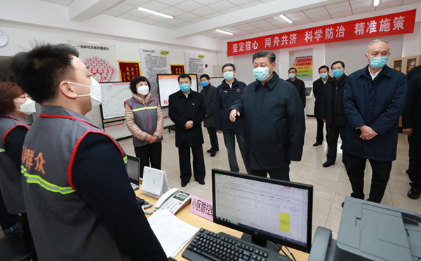 習(xí)近平首先來到北京市朝陽區(qū)安貞街道安華里社區(qū),了解基層一線疫情聯(lián)防聯(lián)控情況。在社區(qū)居民委員會(huì)疫情防控指揮部,習(xí)近平聽取了安貞街道和安華里社區(qū)開展聯(lián)防聯(lián)控情況介紹。習(xí)近平對(duì)社區(qū)采取多項(xiàng)措施,落實(shí)防控責(zé)任,實(shí)現(xiàn)入戶排查、重點(diǎn)群體監(jiān)控“兩個(gè)全覆蓋”等做法表示肯定。他強(qiáng)調(diào),社區(qū)是疫情聯(lián)防聯(lián)控的第一線,也是外防輸入、內(nèi)防擴(kuò)散最有效的防線。把社區(qū)這道防線守住,就能有效切斷疫情擴(kuò)散蔓延的渠道。全國都要充分發(fā)揮社區(qū)在疫情防控中的阻擊作用,把防控力量向社區(qū)下沉,加強(qiáng)社區(qū)各項(xiàng)防控措施的落實(shí),使所有社區(qū)成為疫情防控的堅(jiān)強(qiáng)堡壘。要以疫情防控工作成效來檢驗(yàn)和拓展“不忘初心、牢記使命”主題教育成果,發(fā)揮基層黨組織政治引領(lǐng)作用和黨員先鋒模范作用,把社區(qū)居民發(fā)動(dòng)起來,構(gòu)筑起疫情防控的人民防線。