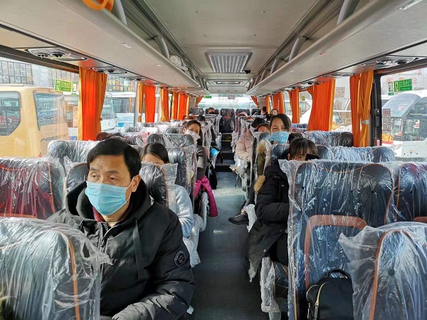 全縣各鄉(xiāng)鎮(zhèn)積極行動,組織專車把農(nóng)民工運送到臨泉客運站,再由站務人員配合社區(qū)衛(wèi)生服務中心對進站農(nóng)民工進行健康體檢,做好信息登記。在確定身體健康、佩戴口罩的前提下,進行行包安檢,安排他們進站乘車,目前首批運送農(nóng)民工已達96人。為確保運輸途中安全,車站嚴格按照車輛核定載客人員的50%控制客座率,安排4輛大巴運送。此外,隨車人員負責引導乘客間保持一定距離,將車廂后兩排作為途中留觀區(qū)域;每車配備體溫計,每間隔2小時為乘客測量一次體溫,確保所有人員不帶病出行。