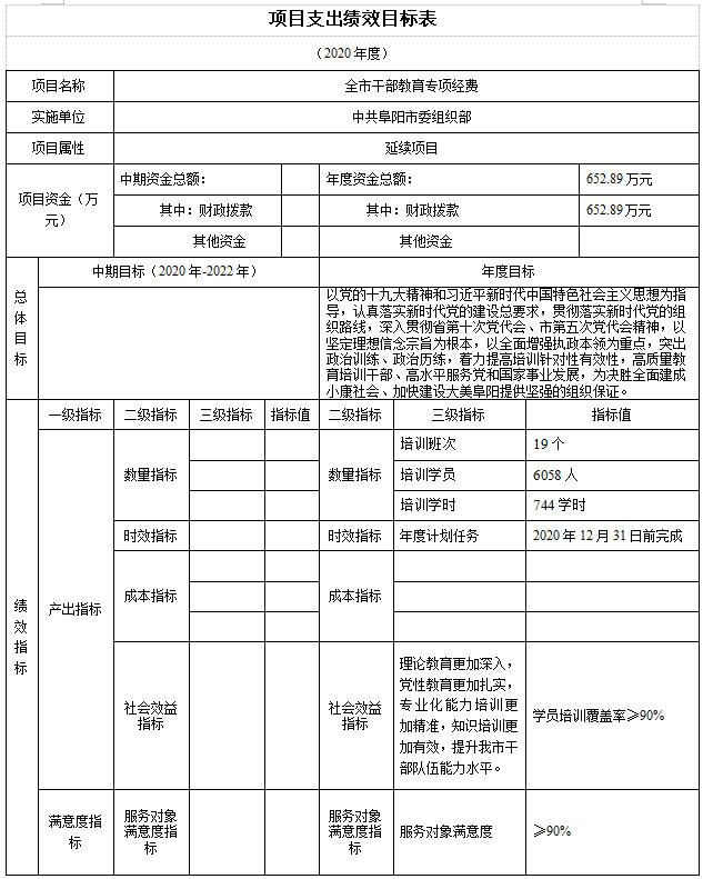 2020年,中共阜陽市委組織部10個(gè)項(xiàng)目實(shí)行了績(jī)效目標(biāo)管理,涉及一般公共預(yù)算當(dāng)年財(cái)政撥款3037.49萬元、政府性基金預(yù)算當(dāng)年財(cái)政撥款0萬元。