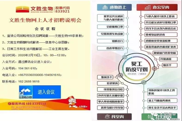 為防止疫情期間人員聚集,文勝生物工程股份有限公司黨支部轉(zhuǎn)變思路,充分利用網(wǎng)絡(luò)平臺,將“面對面”面試換為“網(wǎng)對網(wǎng)”面試,與中科大、合工大、阜師大、經(jīng)管學(xué)院等16家高校聯(lián)合開展“感召青年創(chuàng)業(yè),共創(chuàng)智能時代”線上活動,組建“文勝生物青年就業(yè)創(chuàng)業(yè)平臺”群,搭建招聘“騰訊小會議室”,為創(chuàng)業(yè)青年提供四大基地,三大保障,并通過廣泛邀約、招聘小論壇、視頻面試等流程選拔出符合公司要求的人才。