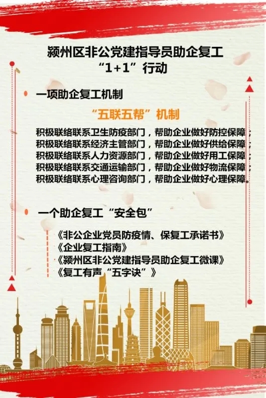 潁州區(qū)出臺(tái)疫情防控期間工業(yè)企業(yè)復(fù)工復(fù)產(chǎn)指南、助企復(fù)工“五聯(lián)五幫”機(jī)制和助企復(fù)工“安全包”。令出即行,“紅色護(hù)衛(wèi)隊(duì)”第一時(shí)間成立,30名區(qū)直機(jī)關(guān)黨員干部從“疫”線一夜變身潁州經(jīng)濟(jì)開發(fā)區(qū)規(guī)上企業(yè)包保人,開啟“白+黑”、“5+2”工作模式。白天,了解復(fù)工情況,負(fù)責(zé)疫情防控跟蹤指導(dǎo)服務(wù);晚上,搜集整理非公企業(yè)在復(fù)工復(fù)產(chǎn)時(shí)遇到的問題。