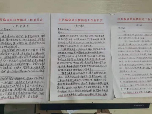 近日,臨泉縣城市管理行政執(zhí)法大隊田橋中隊黨支部收到三份入黨申請書。三份入黨申請書整整八頁,有的筆跡娟秀,有的一絲不茍。字里行間,情真意切,催人奮進 , 細讀之下,令人動容。