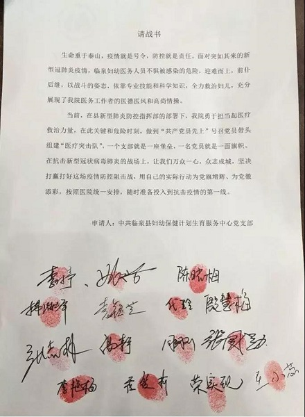 在疫情兇猛撲來(lái)的時(shí)刻,臨泉縣婦幼保健院黨員們雖然沒有百毒不侵的軀體,卻憑著一腔熱血、一份責(zé)任,挺身而出、主動(dòng)請(qǐng)纓,簽下了請(qǐng)戰(zhàn)書:我是中國(guó)共產(chǎn)黨黨員,戰(zhàn)勝疫情,我?guī)ь^!