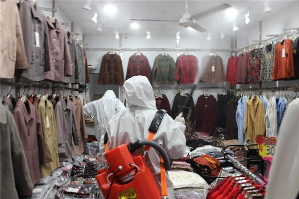 鋪內(nèi)消殺,確保安全。針對(duì)皖西北商貿(mào)城、臨沂商城服裝區(qū)商鋪內(nèi)服裝實(shí)際,委托專業(yè)消殺公司,確保在消殺病毒的同時(shí),店內(nèi)商品的安全。皖西北商貿(mào)城每天投入人員40人,消殺專用車1輛,背負(fù)式消殺設(shè)備20臺(tái)。臨沂商城每天投入人員10人,使用二氧化氯泡騰片進(jìn)行冷霧熏蒸消毒。不僅能保證消毒效果,又不影響服裝的銷售,進(jìn)行全覆蓋式消殺,保證商鋪內(nèi)物品無病原體存在。共消殺商貿(mào)城1653余戶服裝銷售店鋪,店面1482間、邊房171間,消殺面積9.8萬平方;臨沂商城服裝區(qū),對(duì)商戶619戶,店面780間,面積11萬平方米進(jìn)行消殺。