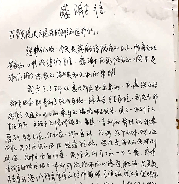 3月18日上午8點半,阜陽師范大學外國語學院教授萬云(化名),已經(jīng)將自己的行李收拾停當。她拿起紙筆,俯身在床頭柜上,認真地寫著:“尊敬的阜陽萬生醫(yī)院隔離點全體醫(yī)護人員……”。寫完,她起身活動了活動發(fā)麻的腳,并按下了呼叫按鈕。