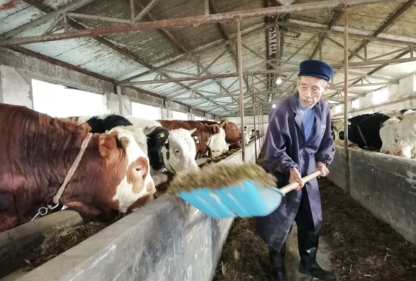 前幾年已脫貧的吳寨居貧困戶高志國(guó),2018年被合作社雇用為飼養(yǎng)員,包吃包住,每月凈掙1800元的工資。自打當(dāng)上了飼養(yǎng)員,他每天守在養(yǎng)牛場(chǎng),給牛定時(shí)喂草料,清理牛舍,精心侍弄著每一頭牛。雖然每天忙忙碌碌,但是高志國(guó)干勁十足,心里也很知足?!跋裎疫@個(gè)歲數(shù),很難找到活干,能在合作社里喂牛、干點(diǎn)零活兒,給這么多工錢,以后日子有奔頭了?!备咧緡?guó)一邊撫摸著牛一邊高興地說(shuō)。