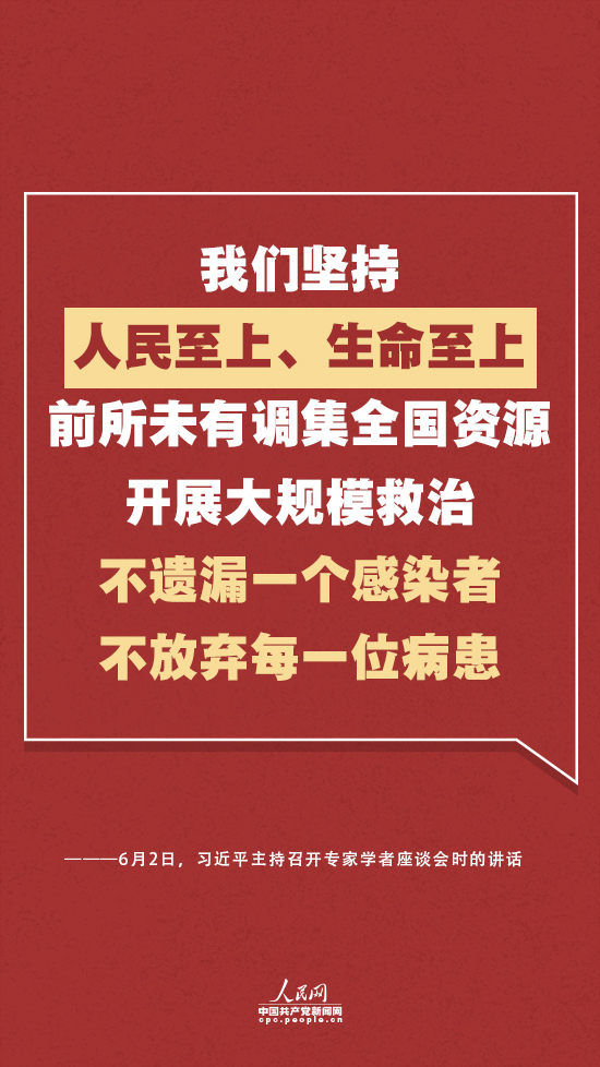 昨日的座談會(huì)上,總書記再次提到“人民至上”。他強(qiáng)調(diào),人民安全是國(guó)家安全的基石。他指出,這次新冠肺炎患者救治工作,我們堅(jiān)持人民至上、生命至上,前所未有調(diào)集全國(guó)資源開(kāi)展大規(guī)模救治,不遺漏一個(gè)感染者,不放棄每一位病患,從出生不久的嬰兒到100多歲的老人都不放棄,確?;颊卟灰蛸M(fèi)用問(wèn)題影響就醫(yī)。