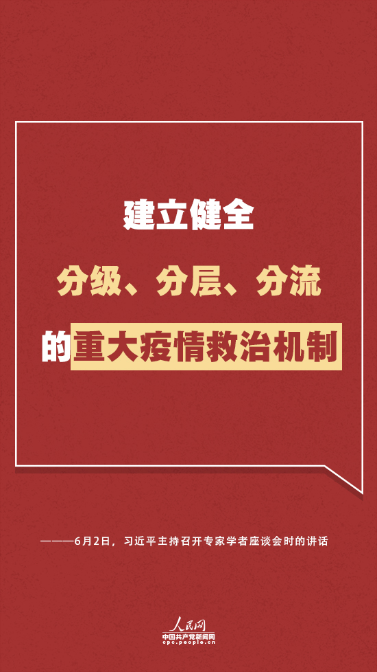 習(xí)近平指出,要統(tǒng)籌應(yīng)急狀態(tài)下醫(yī)療衛(wèi)生機(jī)構(gòu)動(dòng)員響應(yīng)、區(qū)域聯(lián)動(dòng)、人員調(diào)集,建立健全分級(jí)、分層、分流的重大疫情救治機(jī)制。他提出兩大“能力”和一個(gè)“網(wǎng)絡(luò)”等方面的要求: