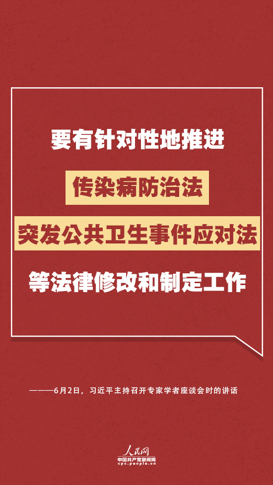 習(xí)近平強(qiáng)調(diào),要有針對(duì)性地推進(jìn)傳染病防治法、突發(fā)公共衛(wèi)生事件應(yīng)對(duì)法等法律修改和制定工作,健全權(quán)責(zé)明確、程序規(guī)范、執(zhí)行有力的疫情防控執(zhí)法機(jī)制,進(jìn)一步從法律上完善重大新發(fā)突發(fā)傳染病防控措施,明確中央和地方、政府和部門、行政機(jī)關(guān)和專業(yè)機(jī)構(gòu)的職責(zé)。