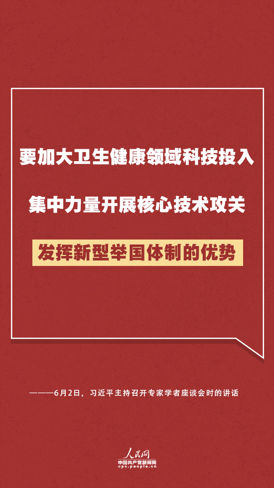在座談會(huì)上,習(xí)近平強(qiáng)調(diào),科學(xué)技術(shù)是人類同疾病斗爭(zhēng)的銳利武器,人類戰(zhàn)勝大災(zāi)大疫離不開(kāi)科學(xué)發(fā)展和技術(shù)創(chuàng)新。要加大衛(wèi)生健康領(lǐng)域科技投入,集中力量開(kāi)展核心技術(shù)攻關(guān),發(fā)揮新型舉國(guó)體制的優(yōu)勢(shì)。