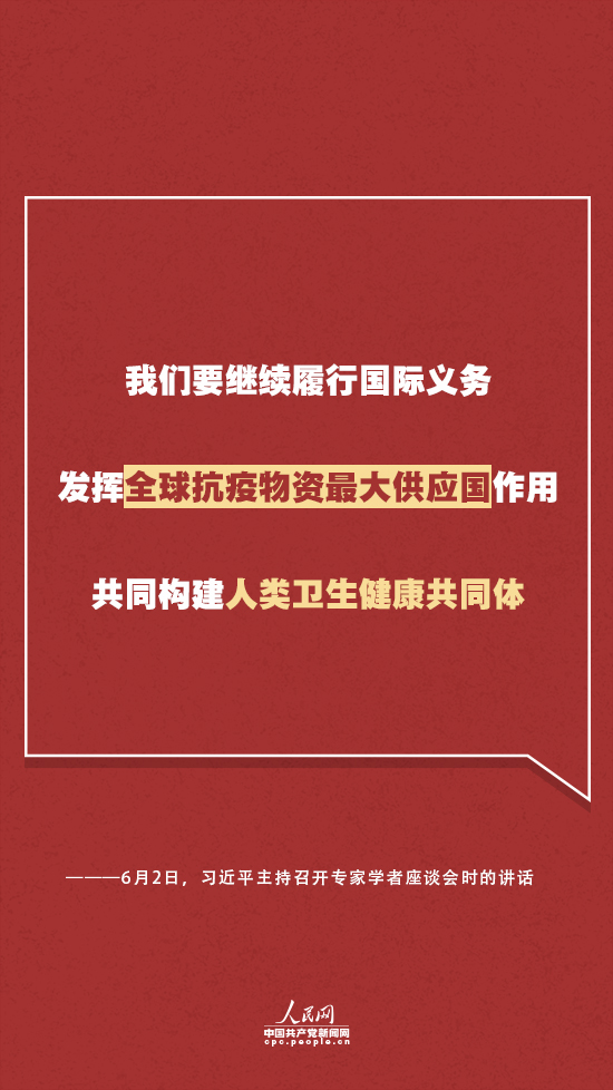 習(xí)近平強(qiáng)調(diào),這次疫情發(fā)生以來(lái),我們秉持人類命運(yùn)共同體理念,積極履行國(guó)際義務(wù),密切同世界衛(wèi)生組織和相關(guān)國(guó)家的友好合作,主動(dòng)同國(guó)際社會(huì)分享疫情和病毒信息、抗疫經(jīng)驗(yàn)做法,向100多個(gè)國(guó)家和國(guó)際組織提供力所能及的物質(zhì)和技術(shù)援助,體現(xiàn)了負(fù)責(zé)任大國(guó)的擔(dān)當(dāng)。我們要繼續(xù)履行國(guó)際義務(wù),發(fā)揮全球抗疫物資最大供應(yīng)國(guó)作用,共同構(gòu)建人類衛(wèi)生健康共同體。