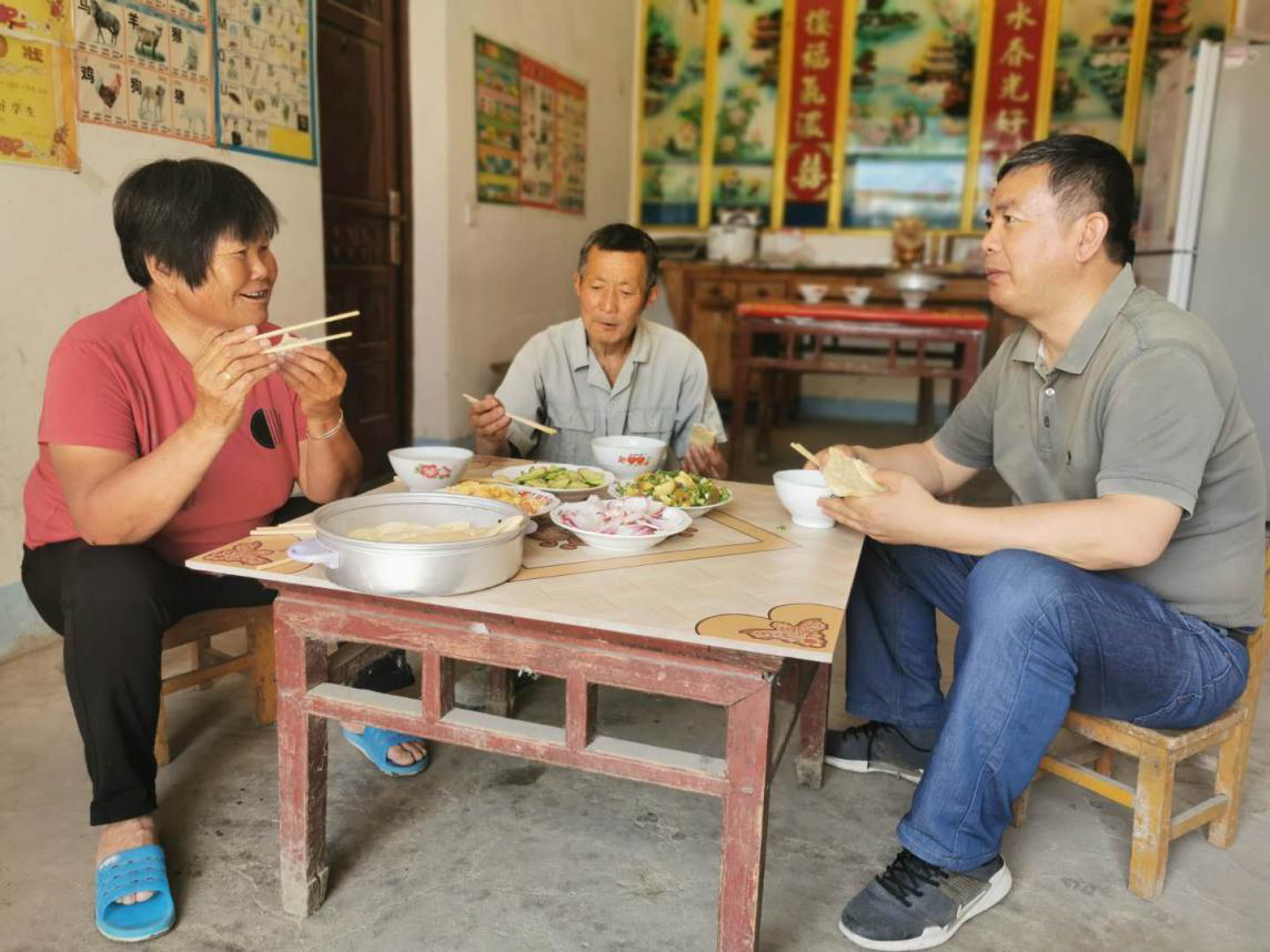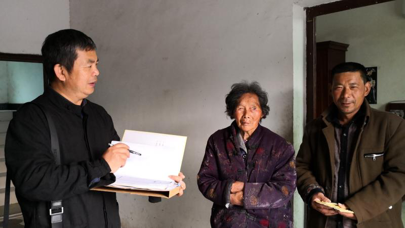 70歲的智障貧困戶陳朝陽,居住的地方遠遠看去像一個廁所,幾平米大的小房沒有門窗、沒有水電,只有地上的一層麥草和兩件臟兮兮衣服,這位老人的生存狀況讓楊益軍深感震驚,他為此徹夜難眠:陳朝陽為何會淪落到這么可憐的地步?村里人為何長期對這個蓬頭垢面的老人熟視無睹?通過對陳朝陽辛酸往事的了解,楊益軍心潮起伏,他主動提出擔(dān)任陳朝陽的包保責(zé)任人,從工資卡中取出一萬元交給施工隊老板,很快為他蓋好了兩間瓦房,安裝了門窗,接通了水電,添置了生活用品,讓這位曾時常隨地而臥的老人過上了有尊嚴的生活,楊益軍在《扶貧日記》寫道:“天下鄉(xiāng)村,親如爹娘;高天厚土,初心難忘。為拉近和他的感情,我雖從不吸煙但口袋里專門備了一包煙,我無數(shù)在村頭給他遞煙點火,無數(shù)次和他面對面溝通交流,試圖讓他感受人間溫情,找回生活的自尊,讓我驚喜的是,今天我去給他貼春聯(lián),貼上春聯(lián)后我請他跟我合影時,沒想到從來面無表情的陳朝陽臉上居然閃過了一絲從未有過的笑容,那一刻,我真的淚流滿面?!?/span>