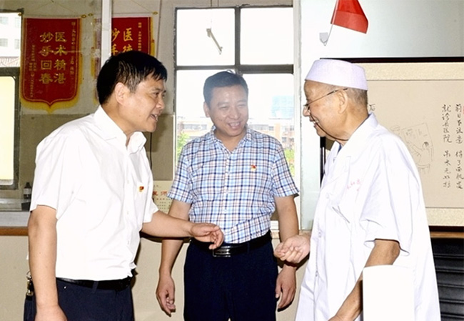 在名老中醫(yī)王啟典診室,趙自強(qiáng)和班文明與八旬高齡的王啟典同志親切交談,對他每天堅(jiān)持坐診的工作精神和發(fā)揮余熱的奉獻(xiàn)精神,給予充分肯定與贊揚(yáng),并囑咐他保重身體。對退休后仍堅(jiān)守崗位的老同志,為醫(yī)院發(fā)展不余遺力、鞠躬盡瘁,表示崇高的敬意和衷心的感謝!