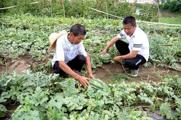 勝華村朱小寨74歲的脫貧戶朱占前正在試驗(yàn)田里采摘西瓜。之前,他一直種植8424品種的西瓜。由于老朱勤勞能干,又頗富經(jīng)驗(yàn),所以種出來的西瓜個(gè)大、味甜、產(chǎn)量高,也就是靠著種植增收,他家才于2018年實(shí)現(xiàn)脫貧。