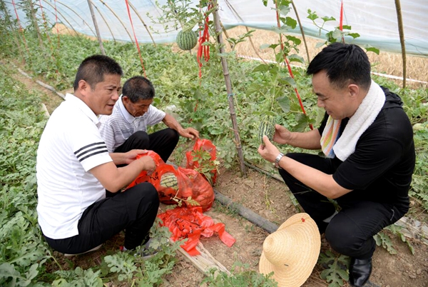 “我們村一些群眾靠種西瓜增收,但是大多在技術(shù)上有局限性,而且一般品種的西瓜幾乎是同時(shí)上市,銷售慢、價(jià)格低,增收效果不佳。因此我們考慮,幫助種植戶引進(jìn)一個(gè)高品質(zhì)、能存放、可運(yùn)輸?shù)男缕贩N,這樣的話,既能避開銷售堵點(diǎn),又能賣上價(jià)格?!眲偃A村扶貧第一書記、黨員曾亞民說。當(dāng)初就是抱著這個(gè)想法,他特意把有名的西瓜種植能手魏照山引薦給朱占前,勸導(dǎo)他與魏照山合作,在原有的種植基礎(chǔ)上,嘗試引進(jìn)新品種,從品質(zhì)和銷售上做文章,從而實(shí)現(xiàn)快速增收致富。