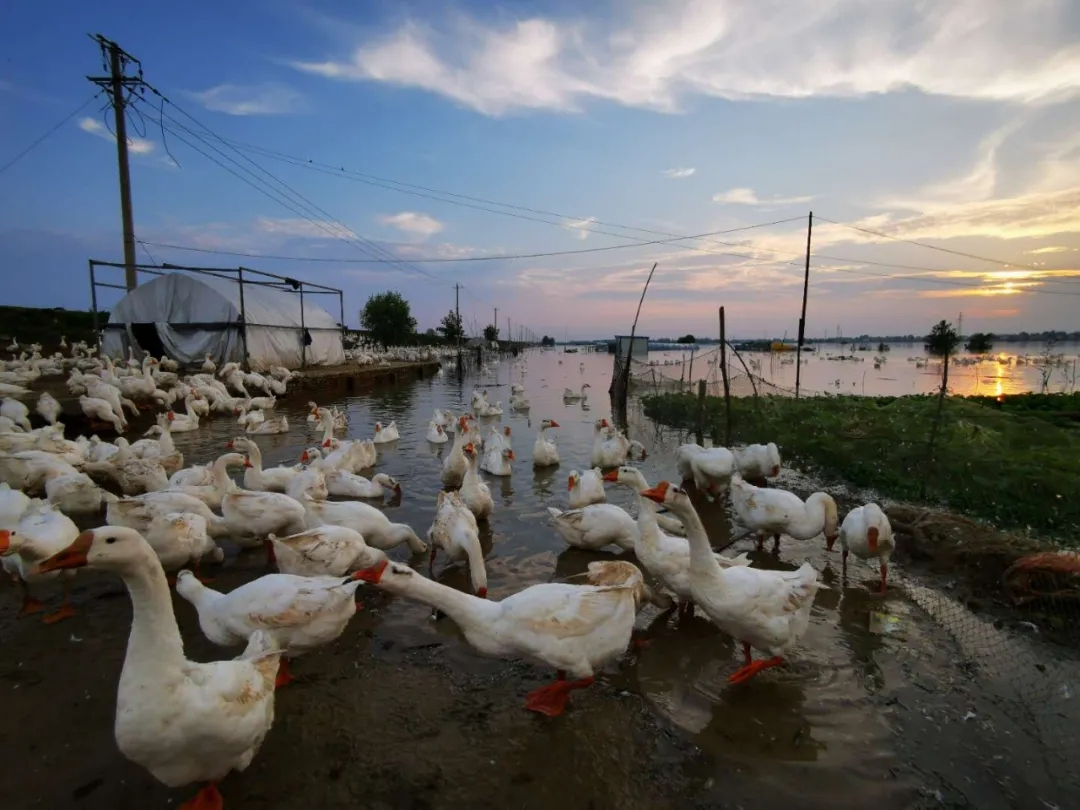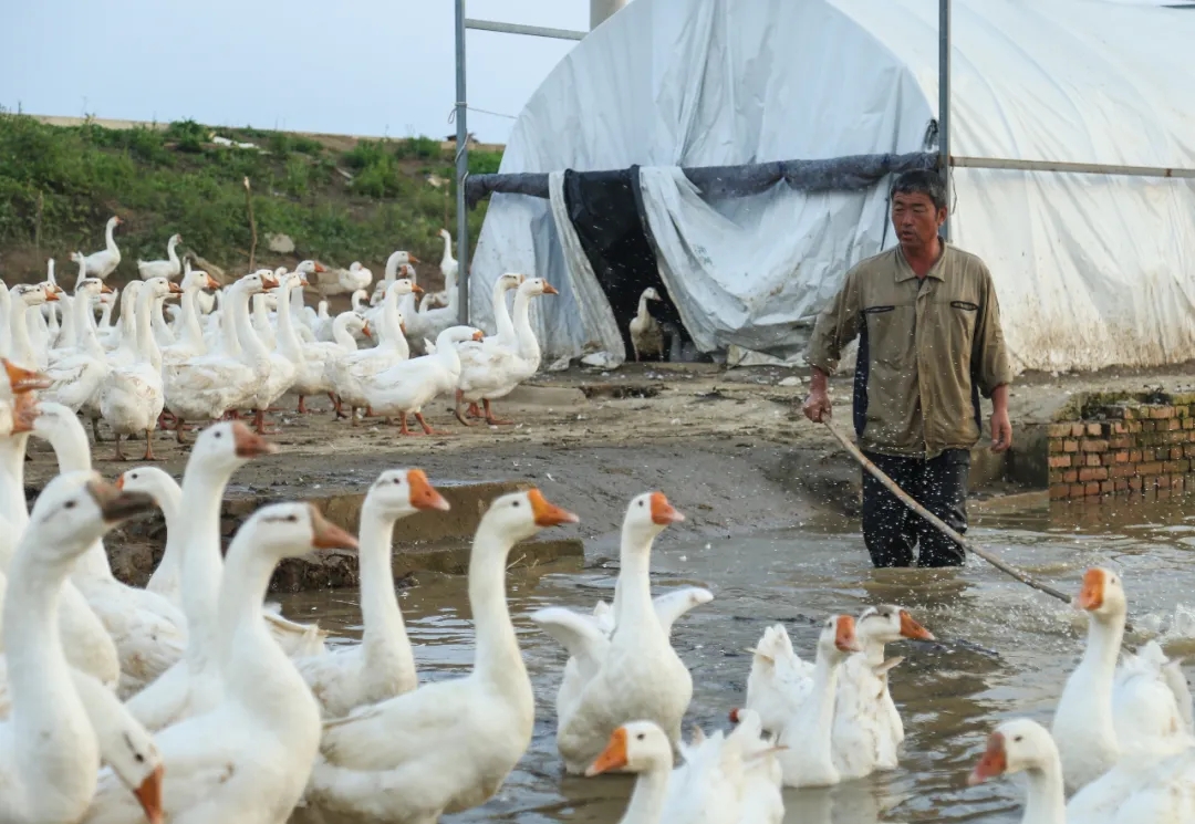 隨著邱家湖水位不斷攀升,7月20日凌晨三點(diǎn),村干部通知村民們緊急撤離,眼看著廠房搬不走,白國良和妻子連夜在堤壩一側(cè)扎上幾百米長的圍欄,連夜將鵝趕到了圍欄里。