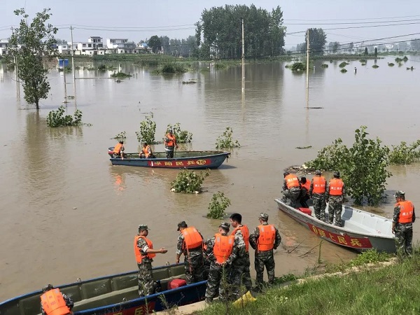 一方有難,八方支援。受連續(xù)強(qiáng)降雨影響,淮河水位暴漲,7月20日上午8時(shí)32分接國家防總命令,千里淮河第一閘阜南王家壩閘開閘放水,濛洼蓄洪區(qū)啟用蓄洪,4個(gè)鄉(xiāng)鎮(zhèn)77個(gè)莊臺(tái)被洪水包圍,阜南、潁上防汛壓力驟增。當(dāng)天,臨泉縣組織120名民兵奔赴王家壩蓄洪區(qū),幫助轉(zhuǎn)移群眾、家畜家禽和生活物資。