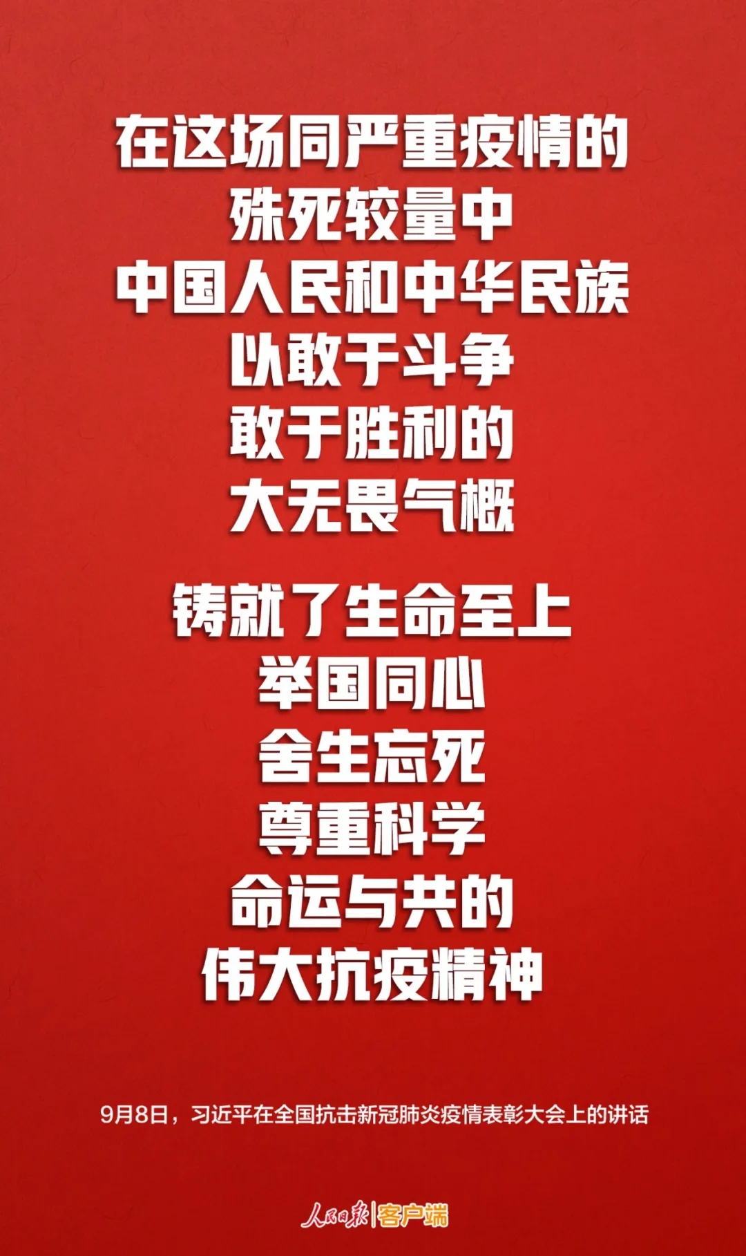 9月8日上午,全國(guó)抗擊新冠肺炎疫情表彰大會(huì)在北京人民大會(huì)堂隆重舉行。習(xí)近平向國(guó)家勛章和國(guó)家榮譽(yù)稱號(hào)獲得者頒授勛章獎(jiǎng)?wù)虏l(fā)表重要講話。在講話中,習(xí)近平就偉大抗疫精神進(jìn)行了深刻闡述。他說,在這場(chǎng)同嚴(yán)重疫情的殊死較量中,中國(guó)人民和中華民族以敢于斗爭(zhēng)、敢于勝利的大無畏氣概,鑄就了生命至上、舉國(guó)同心、舍生忘死、尊重科學(xué)、命運(yùn)與共的偉大抗疫精神。