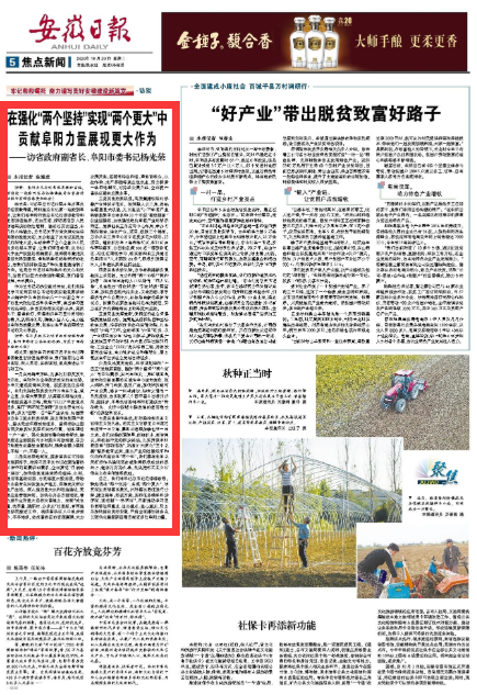 10月20日,《安徽日?qǐng)?bào)》“牢記殷殷囑托奮力譜寫美好安徽建設(shè)新篇章”欄目,刊發(fā)副省長、市委書記楊光榮訪談文章,今予轉(zhuǎn)載。
