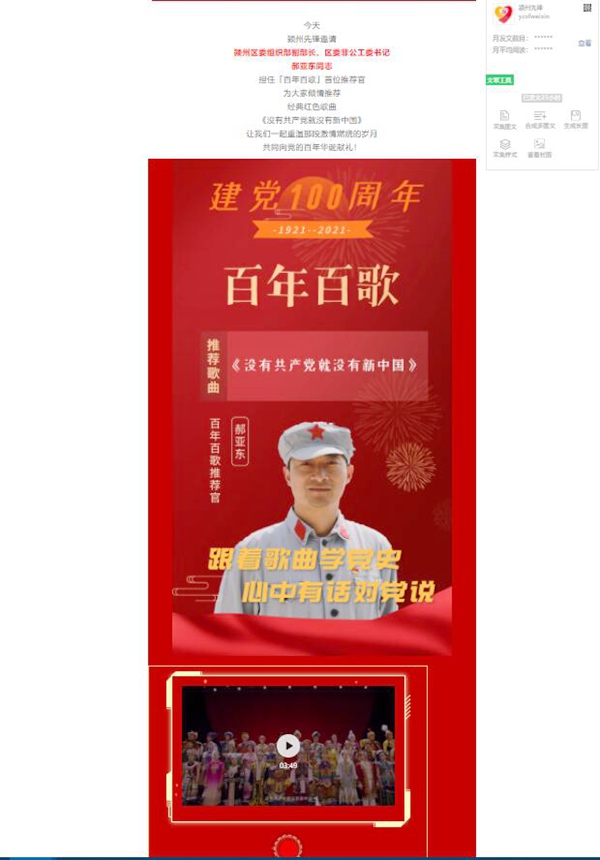 為隆重慶祝中國共產(chǎn)黨成立100周年,全面開展全區(qū)廣大黨員群眾黨史學(xué)習(xí)教育,潁州區(qū)委組織部、潁州區(qū)文學(xué)藝術(shù)界聯(lián)合會、潁州區(qū)婦女聯(lián)合會聯(lián)合主辦慶祝建黨百年百首紅色歌曲展演活動“跟著歌曲學(xué)黨史、心中有話對黨說——「百年百歌」”。本次教育活動由百首紅色歌曲展播及“心里有話對黨說”文本、音視頻征集兩部分內(nèi)容組成。