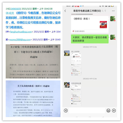 3月22日晚,由中共中央組織部和中央廣播電視總臺聯(lián)合制作的《榜樣5》專題節(jié)目在央視綜合頻道(CCTV-1)首播,阜陽市委組織部及時部署,市黨員電教中心積極響應(yīng),第一時間組織各級黨組織和廣大黨員干部通過先鋒網(wǎng)絡(luò)、遠教站點、遠教廣場等渠道和載體及時收看,迅速在全市各級黨組織和廣大黨員中掀起學習熱潮。