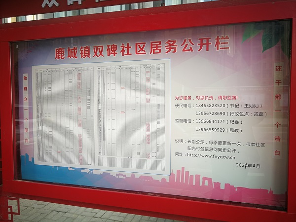 統(tǒng)一公開形式。在全縣推廣“三有一網(wǎng)”的形式對(duì)村務(wù)進(jìn)行全面細(xì)致公開。一是“村有欄”:在村級(jí)活動(dòng)場(chǎng)所合適位置設(shè)置公開欄,將群眾關(guān)心的政務(wù)、財(cái)務(wù)、村級(jí)事務(wù)以及其他群眾比較關(guān)心的熱點(diǎn)、難點(diǎn)問題和應(yīng)當(dāng)讓群眾廣泛知曉或參與的其他事項(xiàng)等進(jìn)行全村公開;二是“莊有牌”:以自然莊為單位,在每個(gè)自然莊路口等合適位置設(shè)置村務(wù)公開牌,將本莊內(nèi)享受到各種支農(nóng)惠農(nóng)政策的村民和戶進(jìn)行公開,接受莊內(nèi)群眾監(jiān)督;三是“戶有單”:以村民組或自然莊為單位印發(fā)村務(wù)公開單,將公開信息發(fā)放到各家各戶;四是“網(wǎng)上同步”:將村務(wù)同步公開到“陽(yáng)光村務(wù)網(wǎng)”、“智慧村里”APP等網(wǎng)絡(luò)平臺(tái)上,接受社會(huì)各界廣泛監(jiān)督。