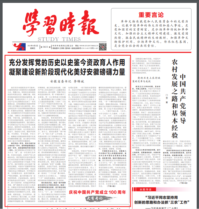我們黨歷來重視黨史學習教育,注重用黨的奮斗歷程和偉大成就鼓舞斗志、明確方向,用黨的光榮傳統(tǒng)和優(yōu)良作風堅定信念、凝聚力量,用黨的實踐創(chuàng)造和歷史經(jīng)驗啟迪智慧、砥礪品格。特別是黨的十八大以來,習近平總書記圍繞黨史發(fā)表了一系列重要論述,系統(tǒng)回顧我們黨團結(jié)帶領中國人民不懈奮斗的光輝歷程,深入總結(jié)黨在各個歷史時期創(chuàng)造的理論成果、積累的寶貴經(jīng)驗、鑄就的偉大精神,深刻闡明黨為中華民族作出的偉大貢獻、為解決人類問題提供的中國智慧、中國方案。這些重要論述,是學習黨史的指導思想,也是學習黨史不可脫離的導讀和領學。我們要深入學習貫徹習近平總書記關于黨史的重要論述,按照黨中央部署要求,認真開展黨史學習教育,充分發(fā)揮黨史以史鑒今、資政育人作用,做到學史明理、學史增信、學史崇德、學史力行,凝聚起全面建設新階段現(xiàn)代化美好安徽的磅礴力量,奮力譜寫中華民族偉大復興興中國夢的安徽篇章。