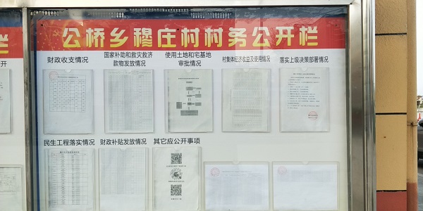 二是硬件保障,豐富公開形式。針對原有村公開欄老破舊、空間小、類別雜等問題,統(tǒng)一更換村級公開欄10個,分為黨務公開和村務公開專欄,預留公開事項名稱,確保公開內容對號入座、一目了然。結合“智慧村里”、一封信等,廣泛公開渠道。目前,122個自然莊莊牌已全部張貼“一村一碼”,將群眾時刻關注的、熱切期盼的、深感疑惑的政策和內容展示在莊牌上,接受群眾監(jiān)督。