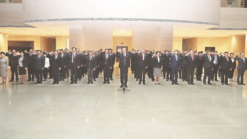坐落于巢湖之濱的渡江戰(zhàn)役紀(jì)念館主場(chǎng)館,猶如兩艘乘風(fēng)破浪的巨型戰(zhàn)艦。上午8時(shí)許,李錦斌、王清憲一行來(lái)到這里,滿懷崇敬之情參觀“百萬(wàn)雄師過(guò)大江”主題展覽。一幅幅黑白照片、一件件珍貴文物,生動(dòng)再現(xiàn)了72年前人民解放軍橫渡長(zhǎng)江的戰(zhàn)斗歷程。大家沿著習(xí)近平總書記考察路線,一邊走一邊看,認(rèn)真聽取講解,不時(shí)駐足詢問(wèn)有關(guān)情況,對(duì)“渡江戰(zhàn)役的勝利是靠老百姓用小船劃出來(lái)的”重要論斷有了更加深刻的認(rèn)識(shí)。紀(jì)念館一樓大廳內(nèi),省級(jí)黨員領(lǐng)導(dǎo)干部和全省優(yōu)秀共產(chǎn)黨員、優(yōu)秀黨務(wù)工作者、先進(jìn)基層黨組織、人民滿意的公務(wù)員、人民滿意的公務(wù)員集體代表排著整齊的隊(duì)列。面向鮮紅的中國(guó)共產(chǎn)黨黨旗,李錦斌舉起右拳,帶領(lǐng)全體同志重溫入黨誓詞:“我志愿加入中國(guó)共產(chǎn)黨,擁護(hù)黨的綱領(lǐng),遵守黨的章程,履行黨員義務(wù),執(zhí)行黨的決定,嚴(yán)守黨的紀(jì)律,保守黨的秘密,對(duì)黨忠誠(chéng),積極工作,為共產(chǎn)主義奮斗終身,隨時(shí)準(zhǔn)備為黨和人民犧牲一切,永不叛黨?!辩H鏘有力的誓言響徹大廳,表達(dá)了對(duì)黨的無(wú)限忠誠(chéng)和牢記初心使命的堅(jiān)定意志。