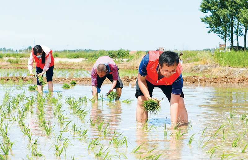 山東省煙臺(tái)市海陽(yáng)市把黨史學(xué)習(xí)教育與群眾所需所盼相結(jié)合,將“我為群眾辦實(shí)事”實(shí)踐活動(dòng)落實(shí)到田間地頭。圖為2021年6月21日,龍山街道的黨員、干部在西沽頭村稻田里幫農(nóng)戶插秧。山東省委組織部供圖 李乃杰、徐藝/攝