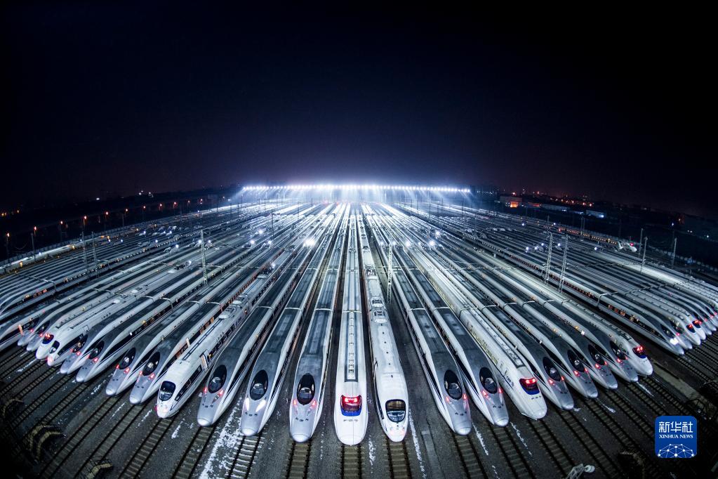 動車組??吭谖錆h動車段的存車線上,準備進行檢修和保溫作業(yè)(2018年2月1日攝)。新華社記者 肖藝九 攝