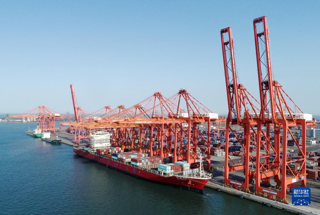 一艘輪船靠泊在唐山港京唐港區(qū)集裝箱碼頭裝貨(4月8日攝,無人機照片)。新華社記者 楊世堯 攝
