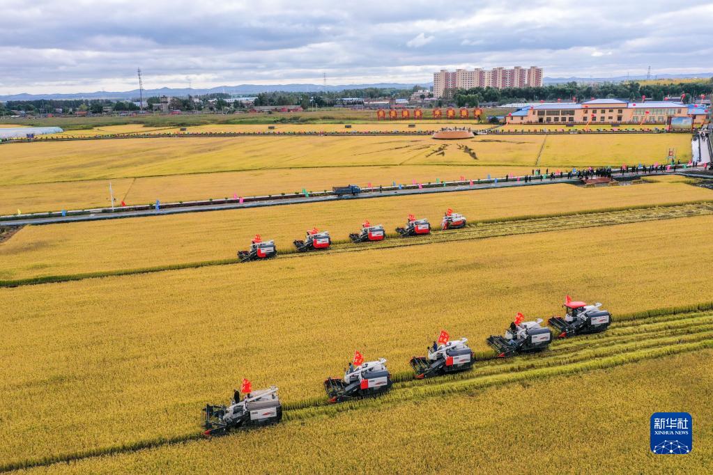 在吉林省長春市九臺區(qū)龍嘉街道紅光村,農民駕駛農機進行水稻收割作業(yè)(9月23日攝,無人機照片)。新華社記者 張楠 攝