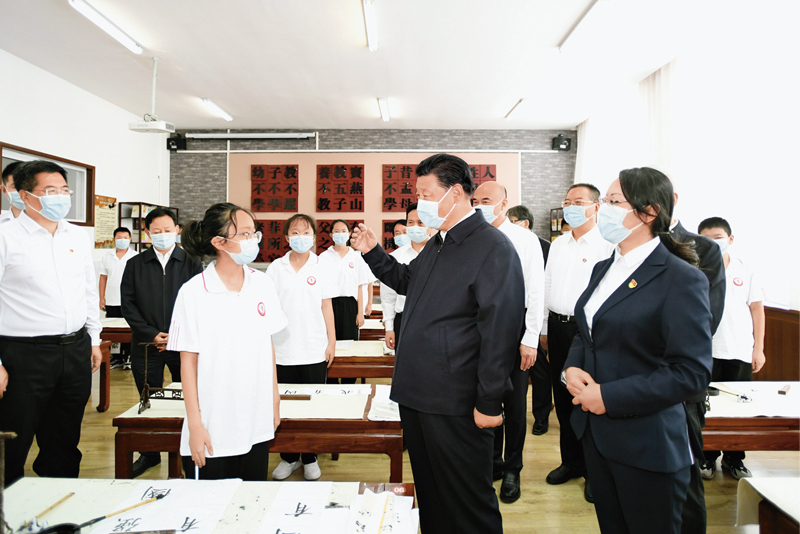 2021年9月13日至14日,中共中央總書記、國家主席、中央軍委主席習(xí)近平在陜西省榆林市考察。這是14日上午,習(xí)近平在綏德實驗中學(xué)考察時,同正在練習(xí)書法的學(xué)生親切交流。新華社記者 李學(xué)仁/攝