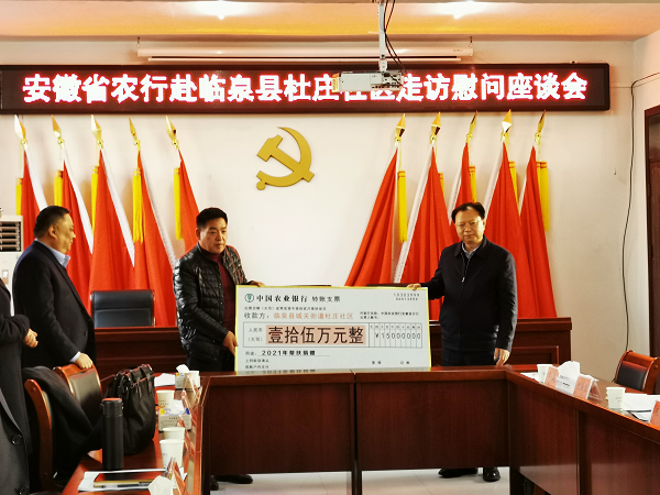 會后,張春林代表安徽省分行向杜莊社區(qū)捐款15萬元,用于杜莊社區(qū)基礎(chǔ)設(shè)施建設(shè),為杜莊社區(qū)鄉(xiāng)村振興奠定堅實基礎(chǔ)。