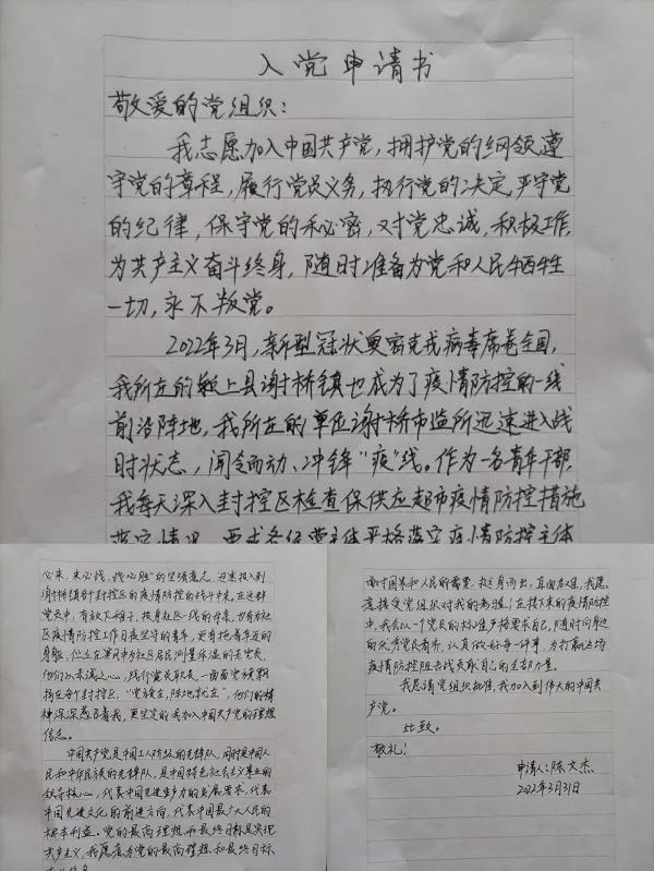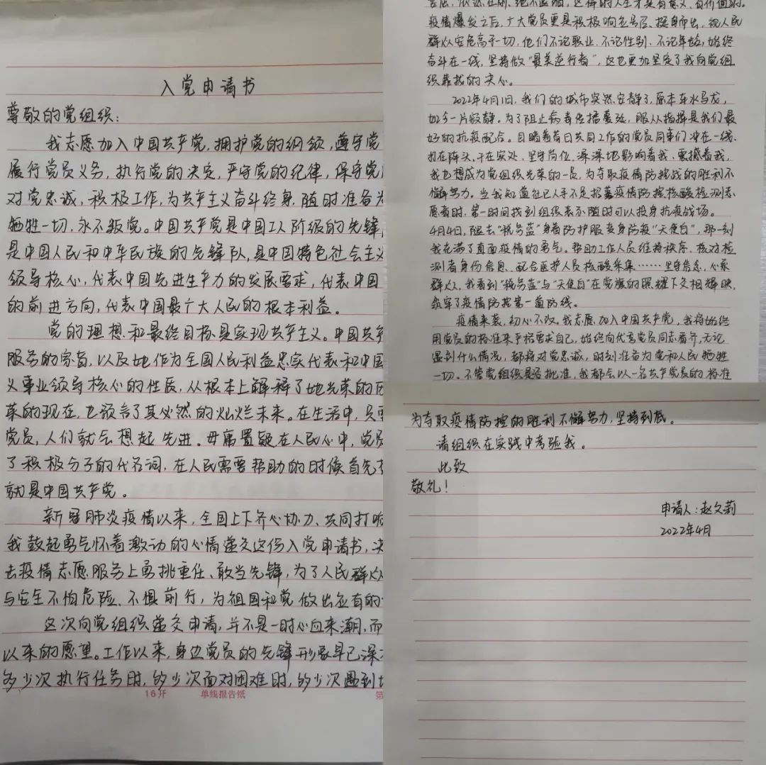 潁上縣此次疫情防控大考,檢驗(yàn)著每一名共產(chǎn)黨員的責(zé)任和擔(dān)當(dāng)。有這么一群年輕人,他們雖不是黨員,卻同樣有黨員的擔(dān)當(dāng)意識(shí)。他們主動(dòng)請(qǐng)戰(zhàn),沖鋒在疫情防控第一線,他們一心向黨,信念堅(jiān)定,寫(xiě)下“為人民服務(wù),請(qǐng)黨組織考驗(yàn)”的入黨志愿書(shū),用實(shí)際行動(dòng)詮釋著志愿加入中國(guó)共產(chǎn)黨的決心與信念。