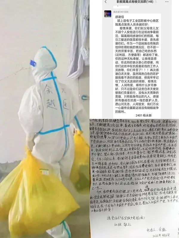 余越積極投身于疫情防控工作,多次帶領(lǐng)核酸采集小分隊(duì)支援迪溝鎮(zhèn)和謝橋鎮(zhèn)核酸采集工作。4月2日又帶領(lǐng)5人小分隊(duì)到潁上職教中心隔離點(diǎn)工作,期間她工作積極主動(dòng),勇于吃苦,樂(lè)于奉獻(xiàn),在隔離點(diǎn)受到大家一致好評(píng)。被隔離人員楊永新特寫(xiě)一封感謝信感謝余越和她帶領(lǐng)的小分隊(duì)。該同志在隔離點(diǎn)向組織提出入黨申請(qǐng)。目前,余越同志仍然冒著高溫奮戰(zhàn)在職教中心隔離點(diǎn)抗疫第一線上。