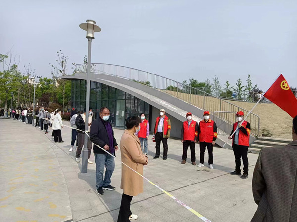 4月19日上午9點,南園社區(qū)居民早早來到躍進湖免費核酸檢測服務(wù)點,他們佩戴口罩,攜帶身份證、戶口本,在社區(qū)工作人員的引導(dǎo)下有序排隊?!罢埓蠹遗宕骱每谡郑藕藐?,每人之間的距離保持在1米……”“請大家提前打開安康碼”。社區(qū)全體干部及縣直下派黨員志愿者們在各自崗位維持現(xiàn)場秩序,引導(dǎo)前來采樣的居民做好個人防護,全程佩戴口罩,保持“一米線”距離。