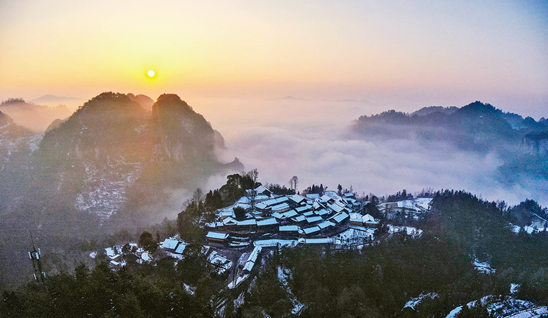 日出美如畫。圖為2022年2月24日拍攝的湖南省湘西土家族苗族自治州花垣縣雙龍鎮(zhèn)十八洞村雪后日出。新華社發(fā) 龍恩澤/攝